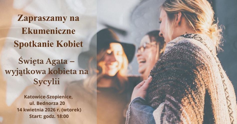 Serdecznie zapraszamy wszystkie Panie na kolejne Ekumeniczne Spotkanie Kobiet, które odbędzie się w najbliższy wtorek, 14 kwietnia o godzinie 18:00 w Katowicach-Szopienicach (w domu parafialnym przy ul. Bednorza 20).